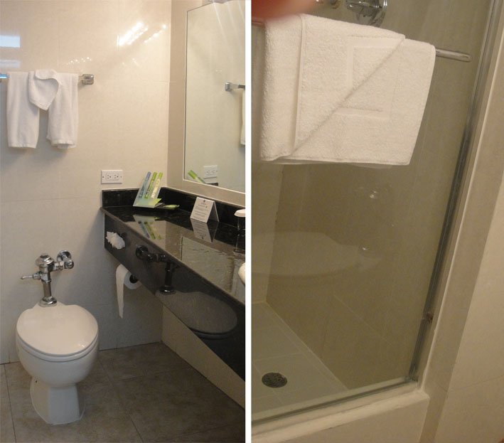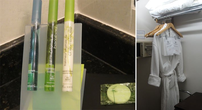 O quarto é bem espaçoso, o nosso tinha 2 camas de casal, um bom banheiro e um armário com tábua de passar, ferro e cofre. E 2 coisas me chamaram atenção: o piso do quarto não era carpete e sim cerâmica e tinha 2 roupões com chinelos acolchoados disponíveis, achei show de bola :).