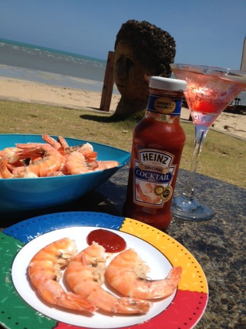 Um deles foi camarão no vapor com Cocktail Sauce da Heinz, é um molho pra frutos do mar maravilhoso, muito semelhante ao servido na Red Lobster, aqui compramos num supermercado na CEASA, quando vamos lá Ricardo compra todos da prateleira (sempre tem 5 ou 6 no máximo, então garantimos logo o sucesso!).