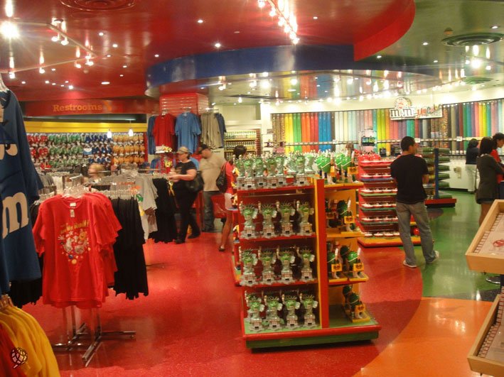 E em 1997 surge a primeira M&M’s Store em Las Vegas, 4 andares de pura delícia e dos mais variados artigos como roupas, toalhas, brinquedos, jogos, material escolar, bonecos gigantes circulando e decorando o ambiente. E essa foi a primeira loja que conhecemos. Fica na Strip ao lado da loja da Coca-Cola e bem próxima ao MGM Hotel.