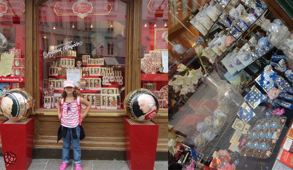 Quando estivemos em Salzburg não tinha como não deixar de experimentar os famosos chocolates Heindl Mozart Kugeln, conhecidos como os chocolates de Mozart. Compramos vários tipos, são vendidos em embalagens com diferentes quantidades. Os mais tradicionais são os recheados com creme de avelã, pistache e marzipan (doce árabe feito à base de amêndoas).
